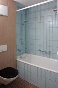 Verspielte Farbkombination im Bad.