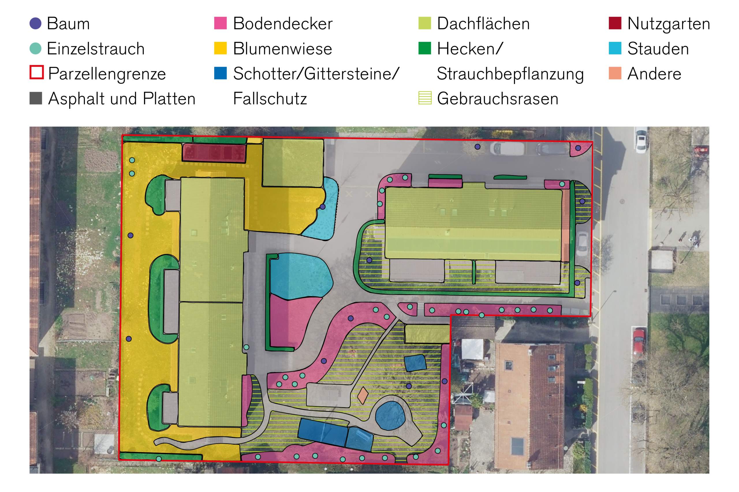 Die Flächen wurden anhand von amtlichen Vermessungsdaten und Luftbildern im GIS eingezeichnet und vor Ort überprüft. Entstanden sind detaillierte Pläne jeder Siedlung. Für Auswertungen können die Informationen nun einfach pro Siedlung, pro Kategorie oder über die gesamte Genossenschaft ausgewertet werden. Zum Beispiel lässt sich ermitteln, dass bei der GWG auf fast 50 000 Quadratmetern Gebrauchsrasen Fussball gespielt werden kann und von 220 000 Quadratmetern Siedlungsfläche mehr als die Hälfte begrünt ist. Auch lässt sich erkennen, dass an der Klosterstrasse auf 946 Quadratmetern der Regen nicht versickert, in den Tössemer Siedlungen 70 Bäume Schatten spenden und dass die Gärtner und Hauswartinnen insgesamt rund 17 000 Quadratmeter Hecken schneiden.