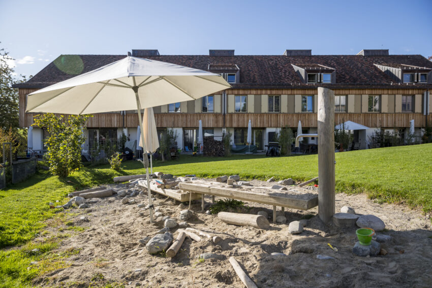 Alte Ziegel aus dem Bestand der Denkmalpflege Thurgau zieren die Dächer des raffinierten Neubaus mit Reihenhäusern, Etagenwohnungen und einem Generationenhaus. In den drei Häusern mit ihren vielfältigen Wohnungen und Reihenhäusern mit 1.5 bis 6 Zimmern sind rund 90 Personen zuhause.