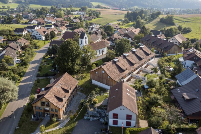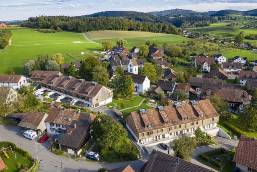 Eingebettet in den historischen Dorfkern: Die Holzbauten unserer Neubausiedlung in Elsau erinnern an ein sogenanntes Flarzhaus – ein ländlicher Bautyp, der im Kanton Zürich weit verbreitet ist.