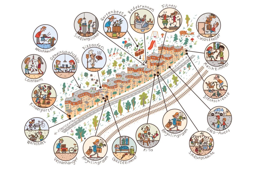 Dank Gästezimmer, Fitness, Siedlungslokal, Spielzimmer, Musikzimmer, Gemeinschaftsbüro oder Leihraum braucht man in der eigenen Wohnung weniger Platz und kommt vielleicht mit einem Zimmer weniger aus. Das macht Sinn, gibt Flexibilität im Alltag – und freut auch das Portemonnaie.