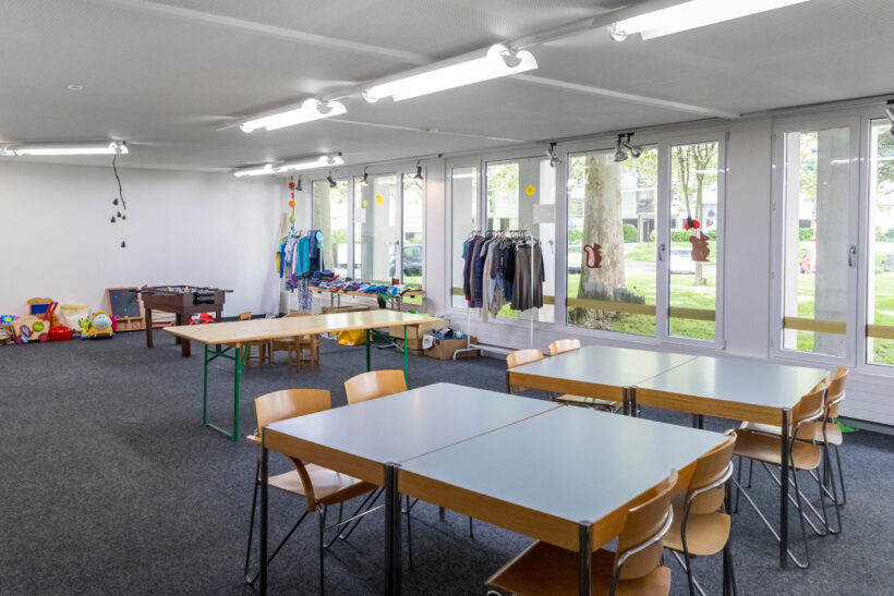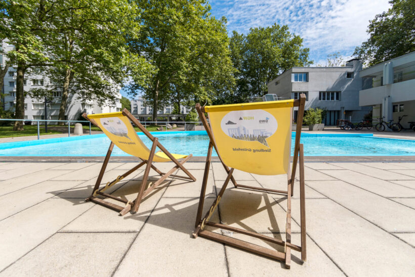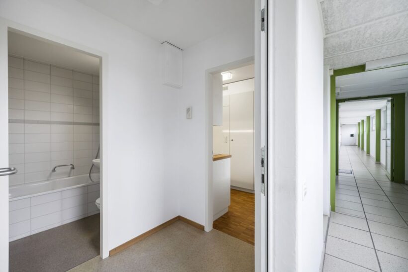 Im Sommer trifft man sich zum Grillplausch an der Feuerstelle, während die Kinder im Pool neben dem Strahleggsaal planschen. Letzteren können die Bewohner:innen für Feste mieten, wenn es im eigenen Wohnzimmer mal zu eng wird. In einem Waschsalon stehen zusätzliche Waschmaschinen und Tumbler zur Verfügung, und in einem kleinen Nähatelier kann man sich die Kleidung flicken, nähen oder bügeln lassen. Zudem koordiniert und unterstützt Sonja Bolla (Siedlungsarbeit) verschiedene Aktivitäten in der Siedlung und ist Ansprechperson für Anliegen zum Zusammenleben. Der Bus Richtung Stadtzentrum fährt praktisch vor der Tür, eine Velofahrt in den Coop Grüze, die Eishalle Deutweg und zum Schulhaus Gutschick dauert je zwei Minuten. Alle Wohnungen verfügen über Balkon, Sitzplatz oder Wintergarten, die grösseren sogar über zwei Nasszellen. In der Tiefgarage gibt es einen Ladeparkplatz für Elektroautos, der reserviert werden kann.