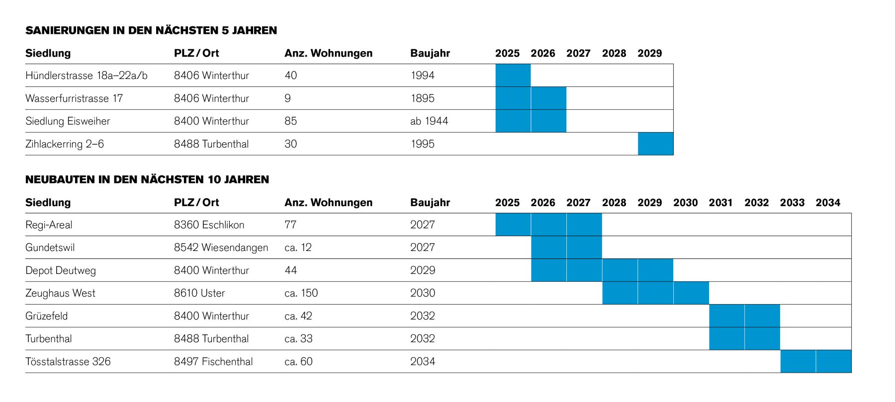 Neu erscheint die Siedlung Zihlackerring in Turbenthal in der 5-Jahresplanung. Der Umfang der Sanierung wird in den kommenden Jahren festgelegt. Die Sanierung soll 2029 umgesetzt werden. Schon heute steht fest, dass die Bewohnerinnen und Bewohner während den Umbauten in ihren Wohnungen wohnen bleiben können.