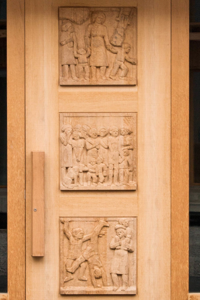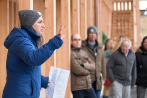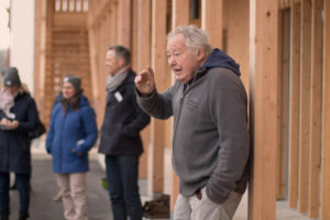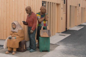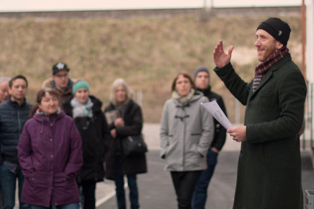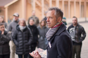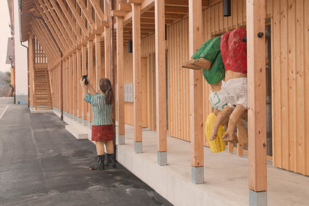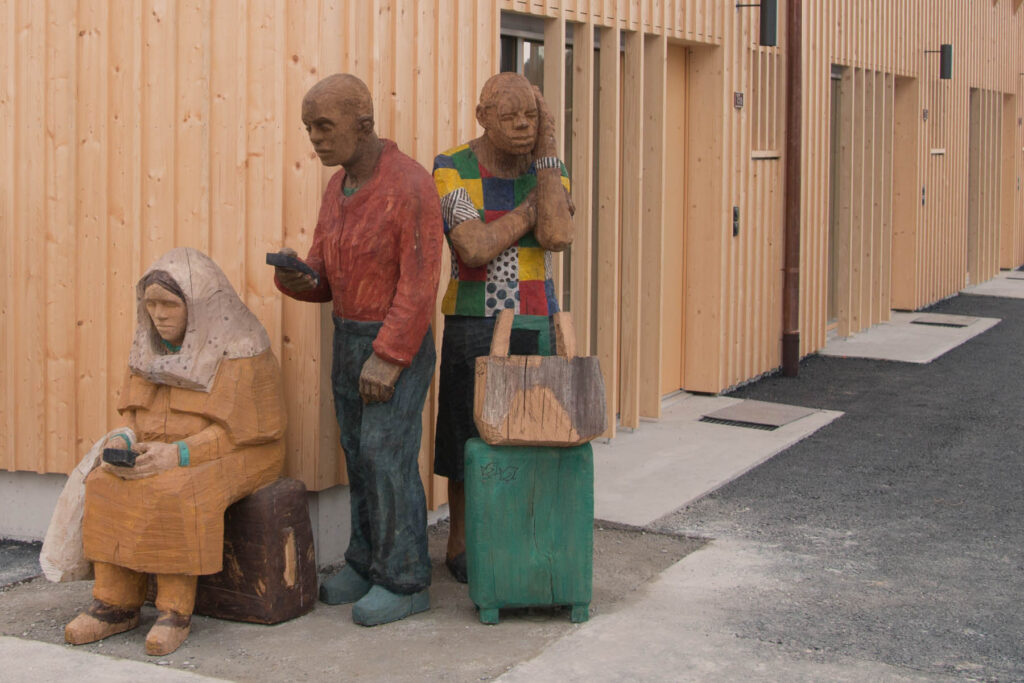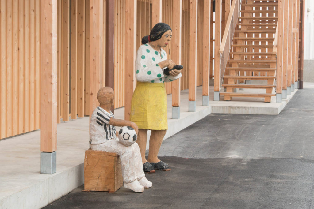 Über 50 neue Bewohnerinnen und Bewohner sind gekommen, um mehr über die neuen Holzskulpturen in ihrer Siedlung zu erfahren. Während Holztafeln an den Eingangstüren Szenen aus der Dorfgeschichte aufgreifen, stellen lebensgrosse Holzfiguren zwischen den Laubengängen Menschen der heutigen Zeit dar.